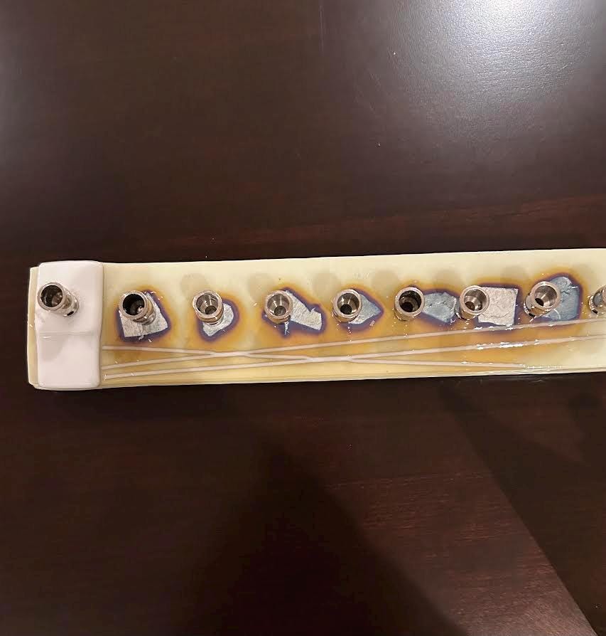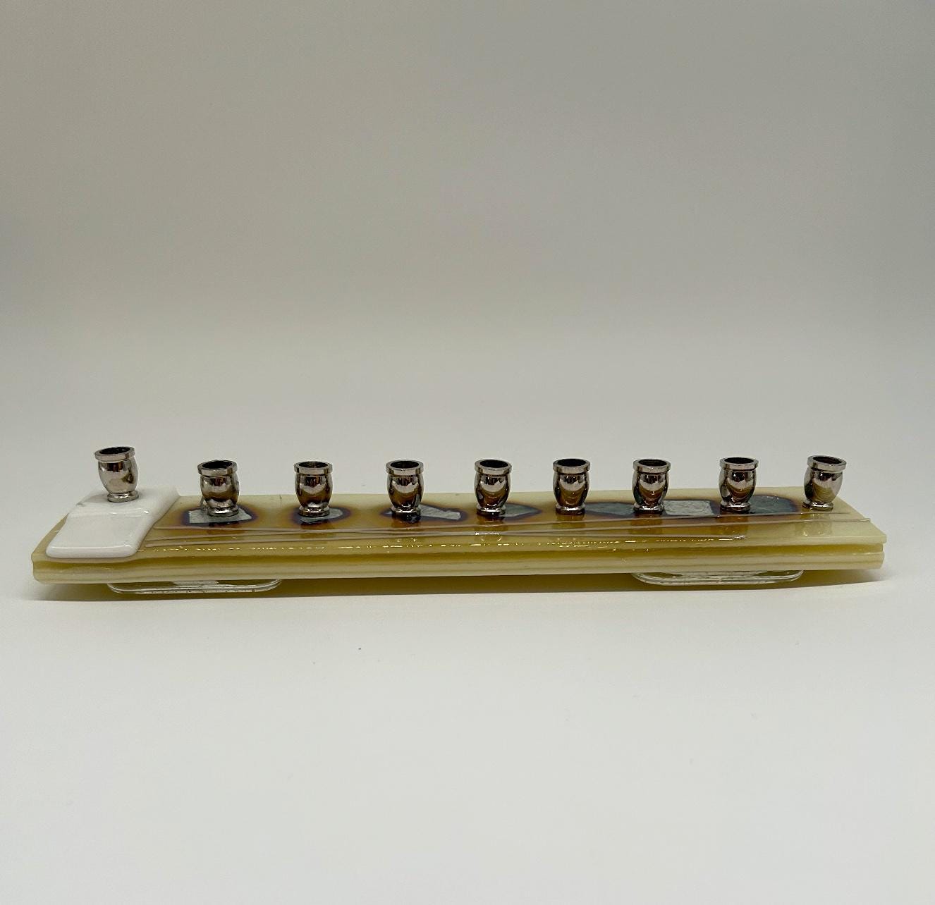 This handcrafted modern glass menorah combines classic tradition with a clean, contemporary aesthetic. The elongated glass form is composed of softly layered cream and ivory tones, with subtle translucency that allows candlelight to glow warmly across its surface. The low, linear silhouette emphasizes simplicity and balance, giving the piece a quiet sculptural presence.