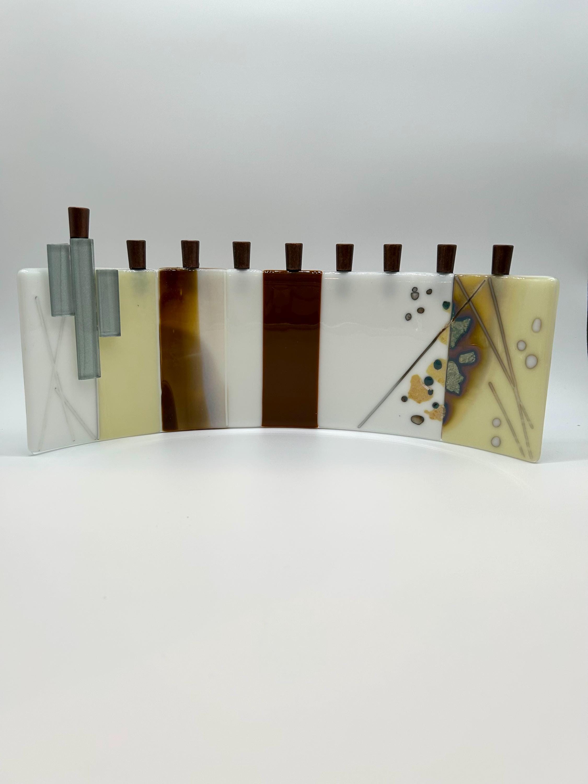 This handcrafted modern glass menorah blends timeless tradition with contemporary design. The gently curved glass body features alternating vertical panels of ivory, white, and warm gold-toned detailing, accented with fine linear texture that adds depth and movement across the form.