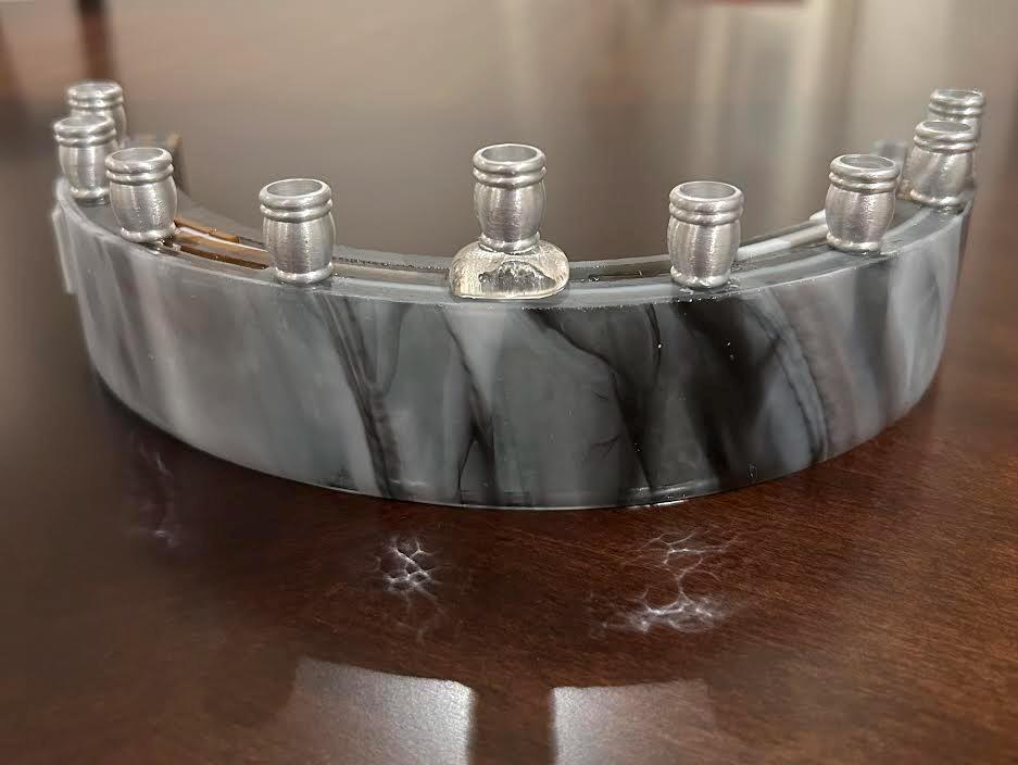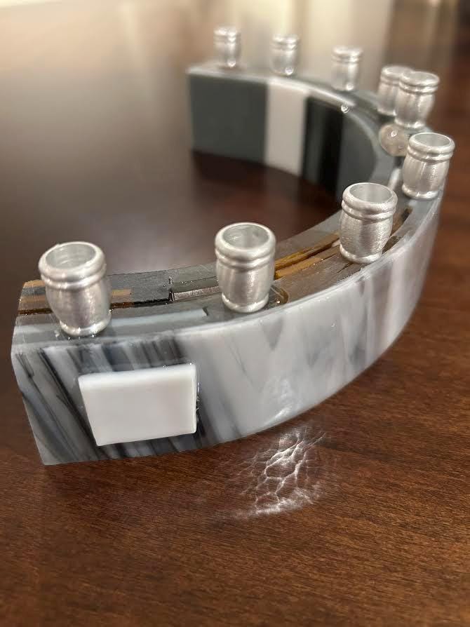 This handcrafted modern glass menorah blends timeless tradition with a refined, contemporary aesthetic. The gently curved glass body features layered marble-inspired tones - soft whites, creams, and subtle gray veining—evoking the elegance of natural stone while maintaining the luminous quality of glass. Variations in translucency and pattern add depth and quiet movement across the surface.