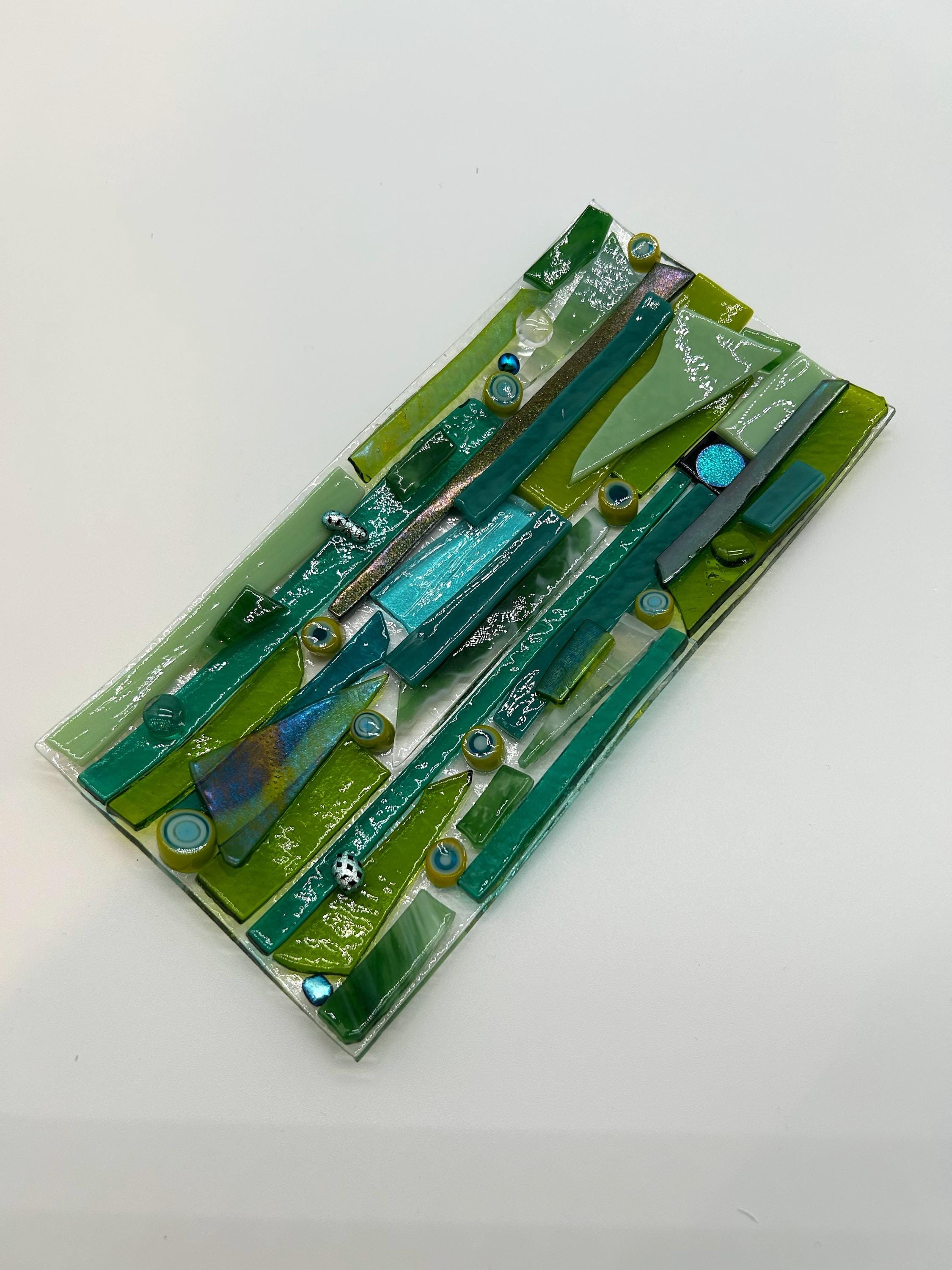 This handcrafted modern glass tray blends organic texture with a contemporary aesthetic. The rectangular glass form is composed of layered seafoam, teal, and olive-green tones, arranged in an abstract mosaic of geometric fragments. Varying levels of translucency, gloss, and subtle iridescent accents create depth and movement across the surface, giving the piece a richly dimensional, tactile quality.