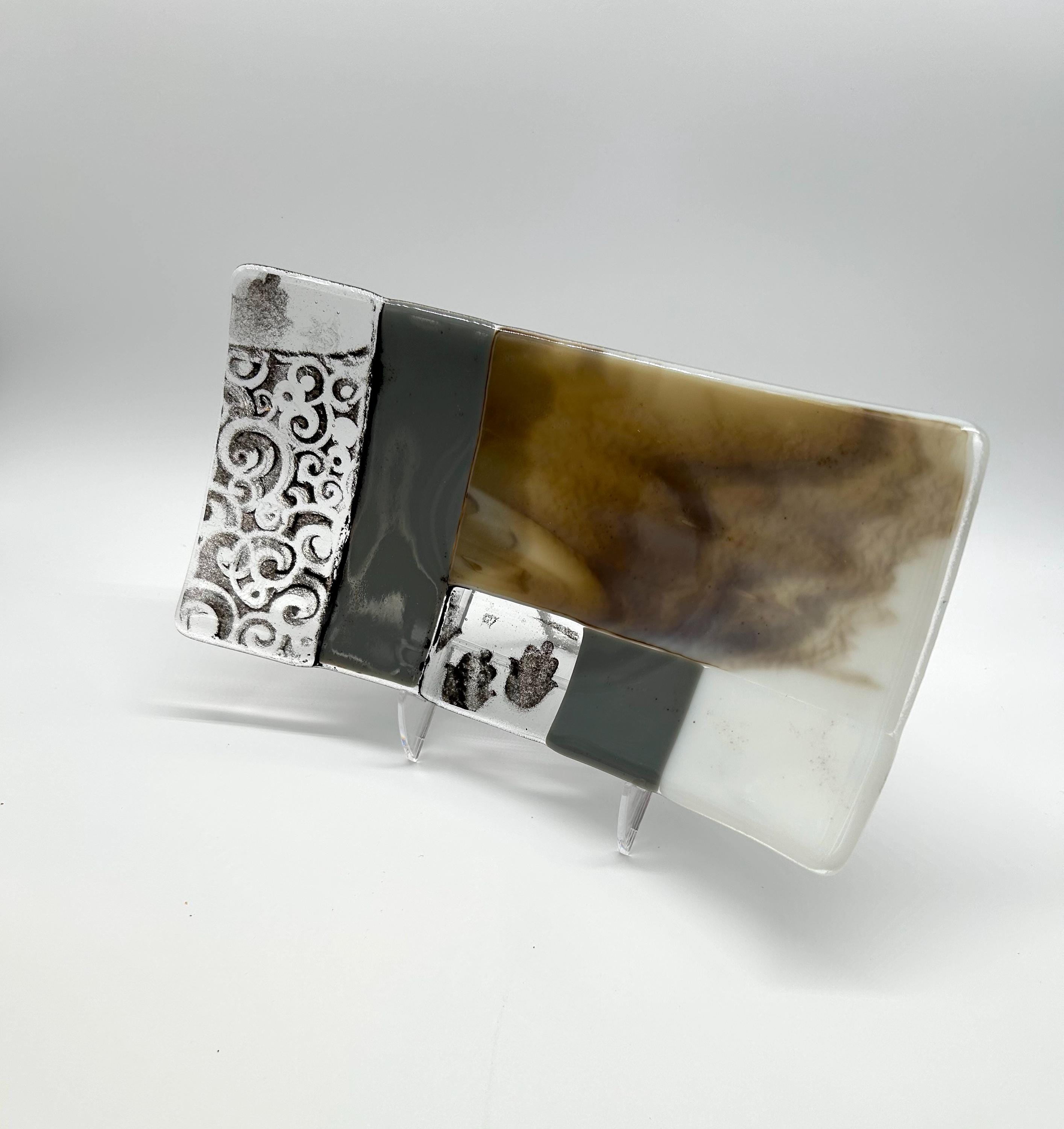 This handcrafted modern glass tray combines organic texture with a softly sculptural form. Gently curved and elongated, the piece features layered panels of warm amber, smoky gray, and milky white glass, creating a natural, stone-like flow across the surface. Intricate grey-toned detailing and embedded textures add depth and character, giving the tray a tactile feel.