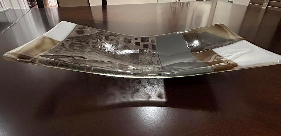 This handcrafted modern glass tray balances clean geometry with richly textured detail. Gently curved with an elongated form, the tray features layered panels of milky white, smoky charcoal, and warm amber glass, creating a striking contrast across the surface. An intricate swirling silver-toned pattern is embedded within the glass, adding depth, movement, and a subtle sense of rhythm.