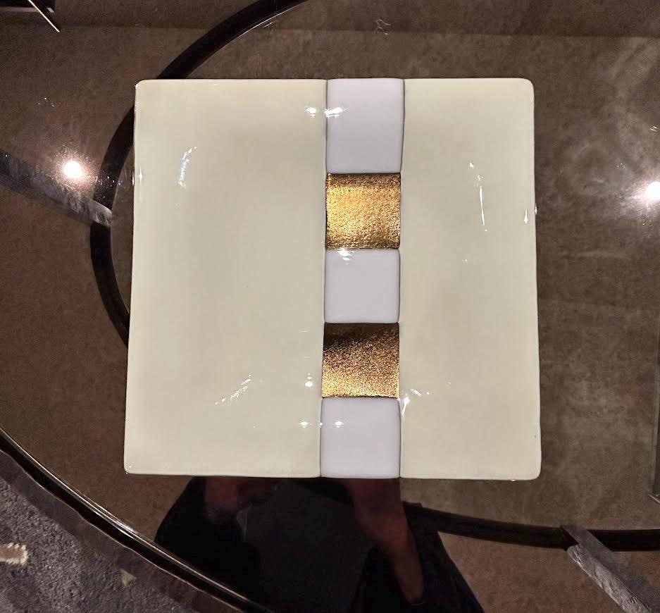 This handcrafted modern glass tray features a clean, architectural square form with a soft, luminous finish. Made in warm vanilla-toned glass, the surface has a subtle, creamy translucence that gently reflects light, giving the piece a calm and elegant presence. A vertical inlay of crisp white glass is punctuated with warm gold-toned accents, adding rhythm and contrast while keeping the overall design minimal and refined.